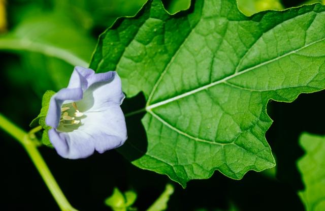 假酸浆,又名蓝花天仙子、鞭打绣球等,是茄科假酸浆属的一年生草本植物。原产地为秘鲁,通过引种后进入我国,多集中在云南、贵州等地区。因其形态非常像酸浆而得名。假酸浆植株挺立,茎有棱条,叶片卵形或椭圆形,绿色,花冠钟状,浅蓝色,现在正值其盛花期。