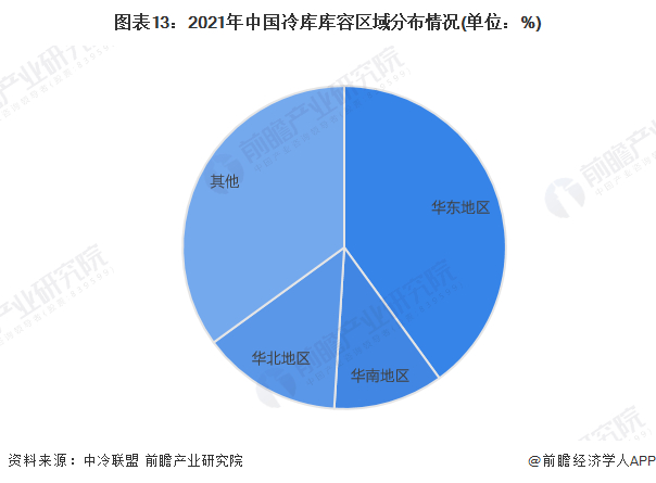 根据全国冷库库容的地区分布情况来看,华东、华南及华北地区的冷库库容容量较大。其中华东地区的冷库库容容量共计2086.31万吨,占比达40%。