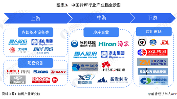 从我国产业链企业布局来看,上游中内部基本设备的代表企业包括精创股份、雪人股份等;配套设备的代表企业包括三一重工等。中游的冷库代表企业包括冰轮环境、冰山集团、海容冷链等。下游应用市场代表企业包括顺丰速运、京东、双汇物流等。