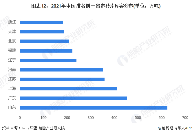 从各省市冷库面积来看,根据中冷联盟公布的数据显示,2021年,我国各省市冷库面积排名前三的分别为山东省、广东省及上海,这三省冷库面积分别为625.28万吨、455.09万吨和410.11万吨。同时结合全国冷库库容总量来计算,前十省市冷库库容集中度超过60%。