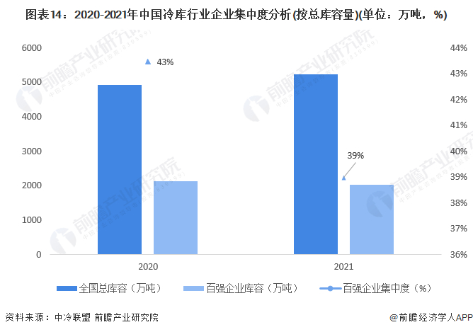 根据中冷联盟2021版《全国冷链物流企业分布图》统计数据,2021年全国冷库总容量为5224万吨,其中冷库百强企业总库容量为2037万吨,约占全国总库容量的39%,同比下降4个百分点,行业整体集中度不高,龙头企业头部企业还在酝酿成长,发展黄金周期依然存在。