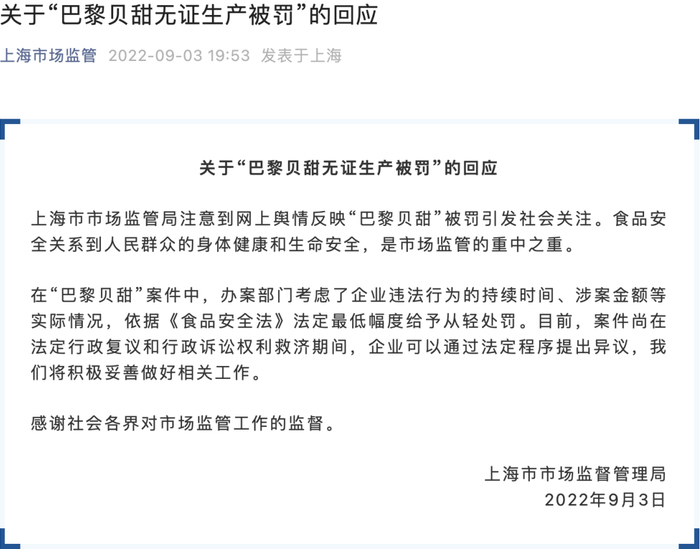 上海市市场监督管理局表示,注意到网上舆情反映“巴黎贝甜”被罚引发社会关注。食品安全关系到人民群众的身体健康和生命安全,是市场监管的重中之重。在“巴黎贝甜”案件中,办案部门考虑了企业违法行为的持续时间、涉案金额等实际情况,依据《食品安全法》法定最低幅度给予从轻处罚。目前,案件尚在法定行政复议和行政诉讼权利救济期间,企业可以通过法定程序提出异议,将积极妥善做好相关工作。