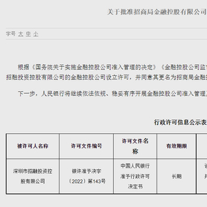 据此前消息,人民银行于2021年12月31日受理深圳市招融投资控股有限公司设立金融控股公司的申请。