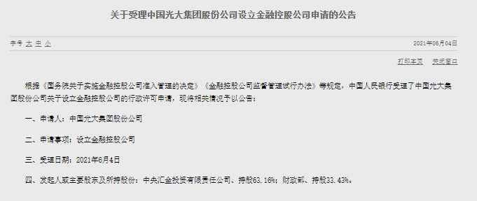 除批准招商局金融控股有限公司设立许可外,今年3月,人民银行还批准中国中信金融控股有限公司(筹)和北京金融控股集团有限公司的金融控股公司设立许可。其中,中国中信金融控股有限公司已于今年3月24日正式成立。