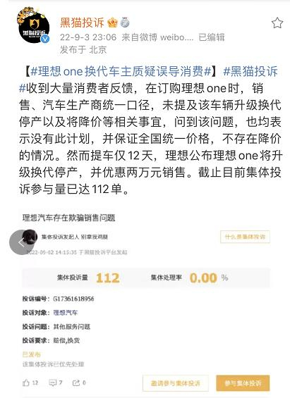 从投诉内容来看,这些理想ONE车主在购车时,销售和生产商并未提及理想ONE将升级换代停产以及降价等相关事宜,即便车主就此提起询问,销售也表示没有计划,并保证全国统一价格,不存在降价情况。但当车主提车不久后,便出现了理想ONE汽车将升级换代停产,并优惠2万元销售的现象。因此,上述车主认为理想汽车存在欺骗、隐瞒、虚假宣传等问题。