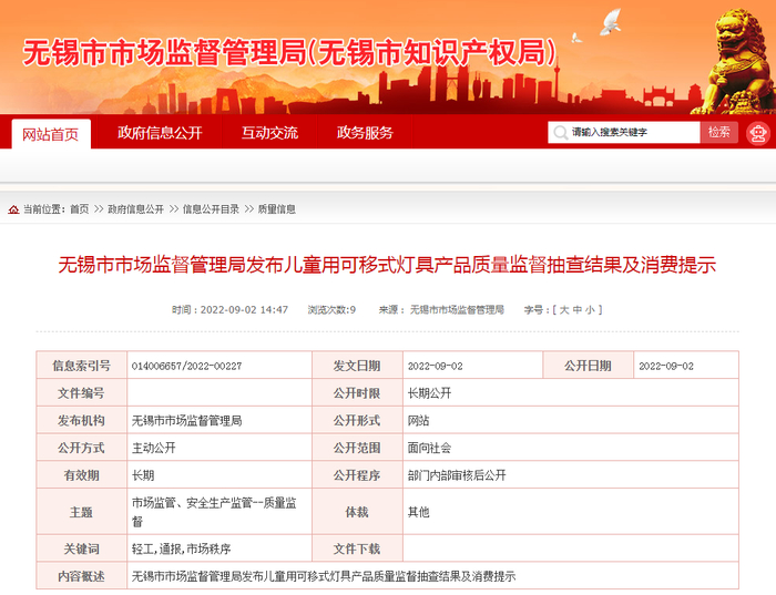 江苏省无锡市市场监管局发布儿童用可移式灯具产品质量监督抽查结果及消费提示