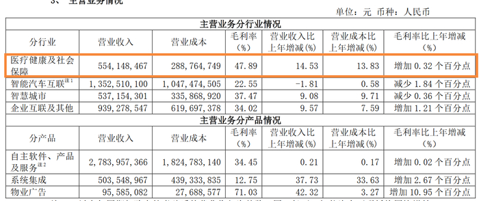 值得关注的是,在上述行业中,医疗健康及社会保障的毛利率最高,为47.89%,该项营业收入比上年增加14.53%。