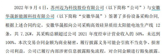 9月4日,迈为股份(300751)发布公告,安徽华晟新能源科技有限公司(安徽华晟)拟向公司采购高效硅异质结太阳能电池生产线12条,共计7.2GW.因涉及商业机密,迈为股份未披露交易价格,但该笔订单金额超过公司2021年营收的50%。