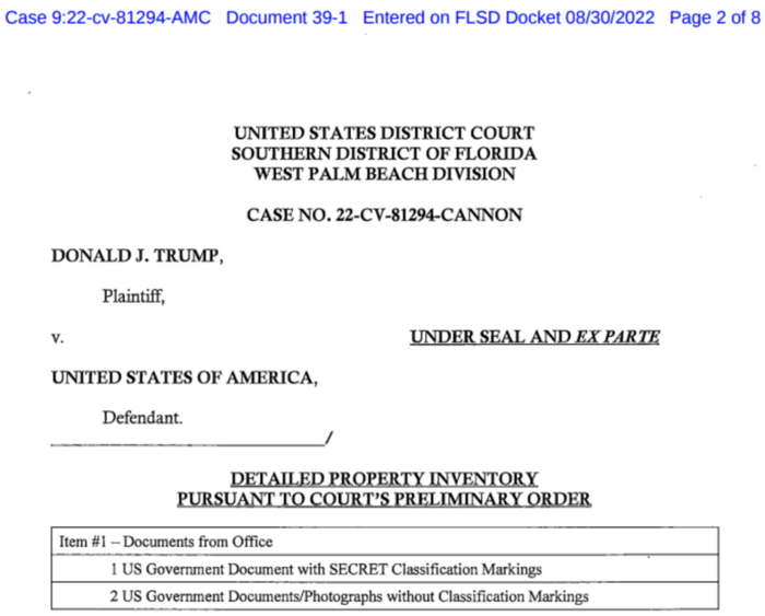 美国前总统特朗普被“抄家”事件再度发酵。据美国《华尔街日报》报道,当地时间9月2日,美国联邦法官公布了联邦调查局(FBI)8月在特朗普住所查获的详细物品清单。这份长达8页的清单显示,FBI从海湖庄园带回了33箱物品,其中包含100多份机密文件。
