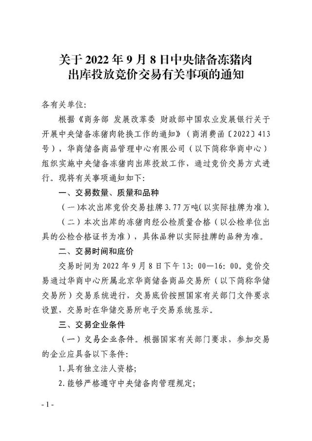 9月5日,华储网发布关于9月8日中央储备冻猪肉出库投放竞价交易有关事项的通知,本次出库竞价交易3.77万吨。