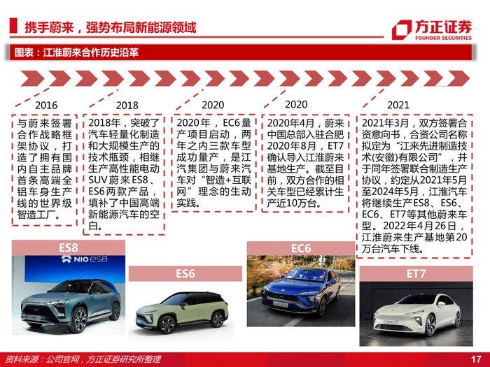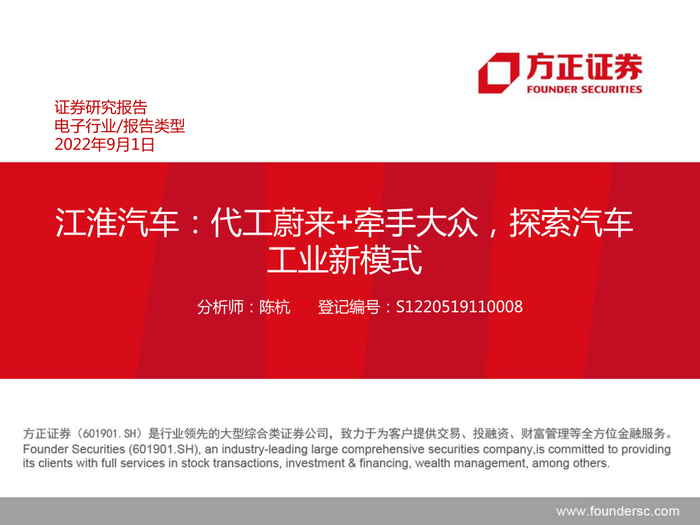 本文来自方正证券研究所2022年9月1日发布的报告《江淮汽车:代工蔚来+牵手大众,探索汽车工业新模式》,欲了解具体内容,请阅读报告原文,陈杭S1220519110008 微信号:ForBetterChina