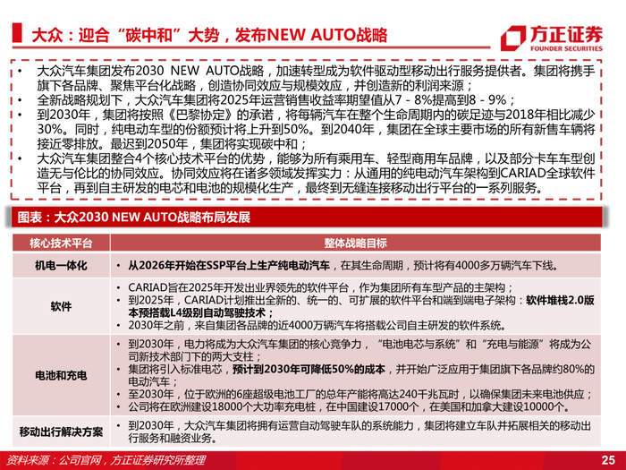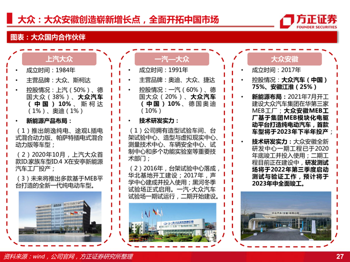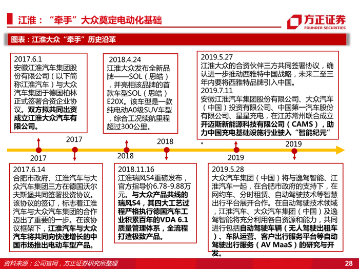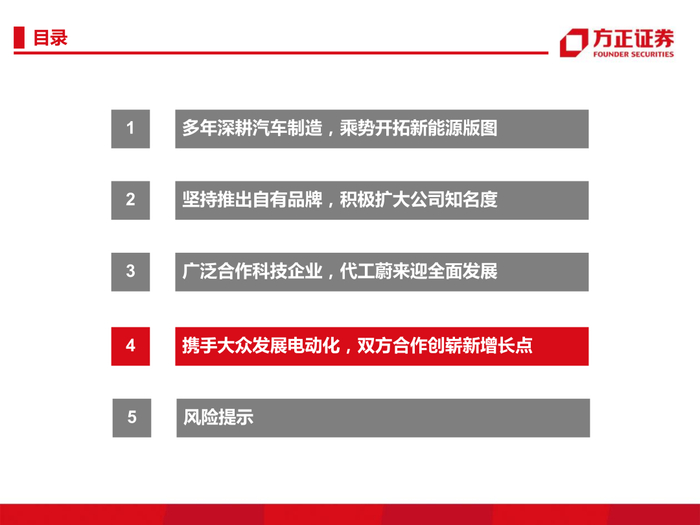4、携手大众奠定电动化趋势,双方合作创造崭新利润增长点。公司与大众合作多年,2017年合作成立大众安徽,建立大众安徽MEB平台,全面打造纯电动汽车。并于今年7月三方签订大众智慧物流项目战略合作协议,公司将携手大众安徽通过该项目探索智能网联汽车应用场景及商业模式。