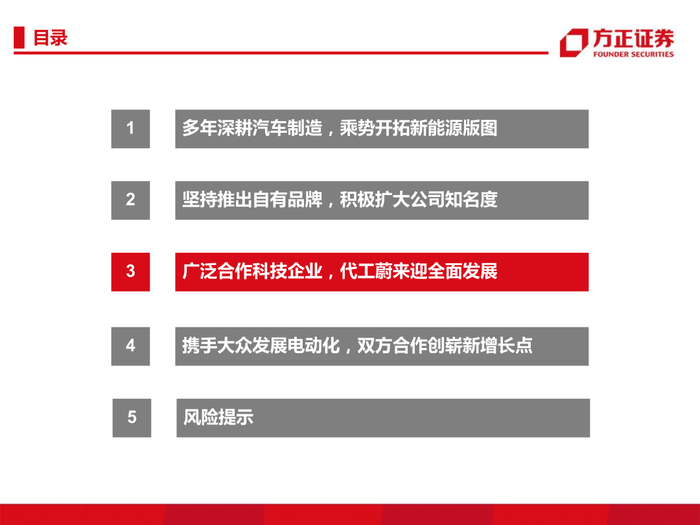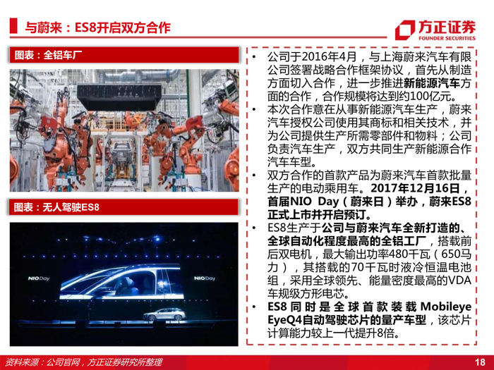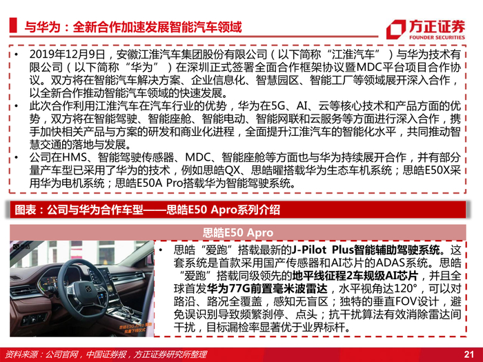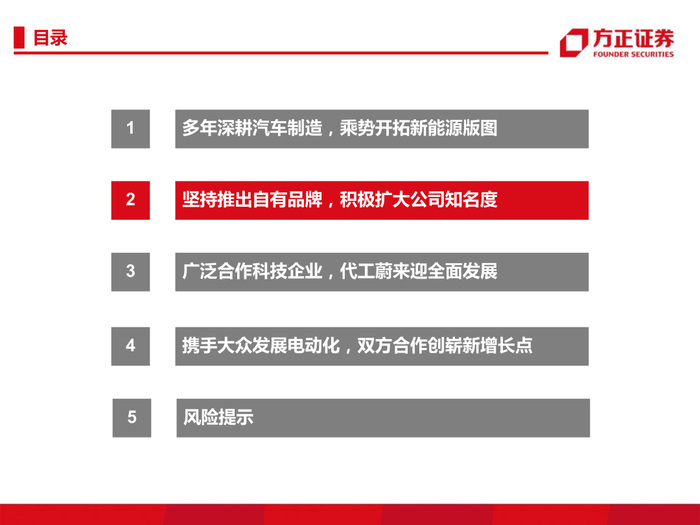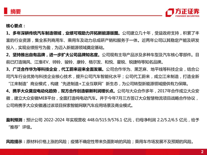 3、广泛合作华为等科技企业,代工蔚来迎来全面发展。公司合作华为、黑芝麻、地平线等科技企业,结合公司汽车行业优势与科技企业核心技术,提升公司汽车智能化水平;公司代工蔚来,成立江来制造,打造全新“江来制造”商业模式,构建“先进制造+工业互联网”新生态,为公司转型新能源领域提供有力保障。