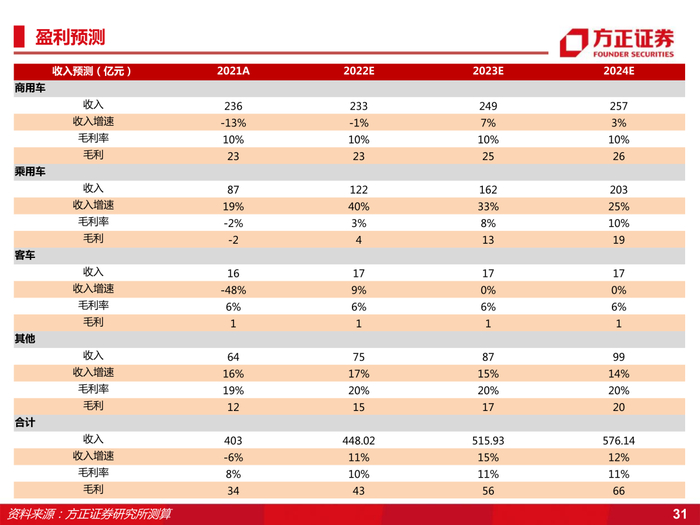 代工(ODM/OEM):“江来”携手,强势转型新能源领域。在高端新能源汽车制造领域,江淮作为蔚来的代工厂,先后完成了ES8、ES6、EC6车型的制造和量产,2020年代工生产超过4.4万辆,2021年交付约9.3万辆。在此基础上,双方继续约定从2021年5月至2024年5月,江淮汽车将继续生产ES8、ES6、EC6、ET7等其他蔚来车型此外,江淮联合蔚来在合肥市合资建厂,成立江来公司,通过整合双方优势,打造全新“江来制造”商业模式,旨在为客户提供智能制造与技术服务解决方案,构建“先进制造+工业互联网”新生态,为公司转型新能源领域提供有力保障。