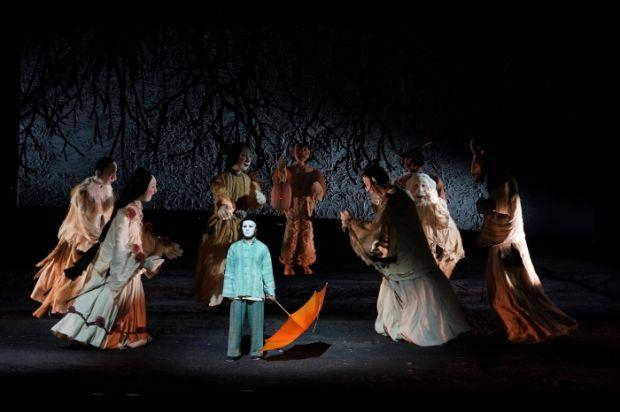 闫锐导演此次大胆地让身着冥界服装的高大人偶来扮演古典戏剧中的歌队角色,八只通体惨白的人偶在舞台之上不仅渲染了恐怖氛围,充满了死亡与报应意象和象征,并成功反衬出身着一袭红衣的金子这一舞台上唯一亮色,让观众的视线更加聚焦于女主角的表演。这一巧妙的设计还让插叙剧情在整体叙事过程中更加连续,并别具一格地演绎出对冥界的诡秘想象,使其成为沟通人界和冥界的桥梁,亦真亦幻。环境塑造和舞台设计使得戏剧时空内部的森然恐怖不断强化,女主角成为天地之间最为鲜红而热烈的色彩,更凸显其形象的反叛精神和对追求自由的坚定。