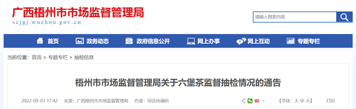 中国质量新闻网讯 近日,广西梧州市市场监督管理局发布关于六堡茶监督抽检情况的通告。