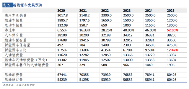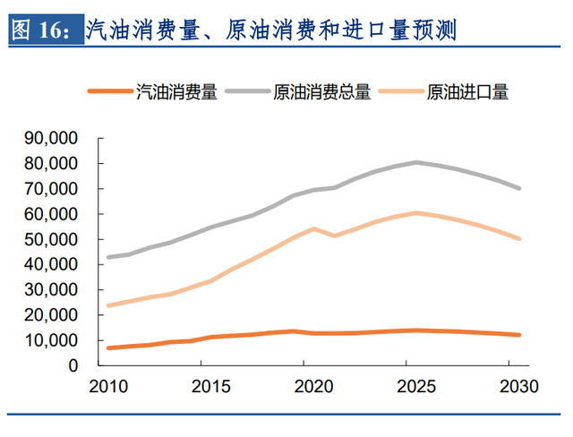 我们测算,原油消费量将在2025年出现拐点。2025年,我国新能源车销量或将达到1300万辆,渗透率达到52%,新能源车占汽车总量的12.4%左右。重要的是,2025年后,每年燃油车的销售量将低于报废量,因此燃油车保有量出现拐点,汽油消费量和原油消费量也相应出现拐点。