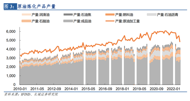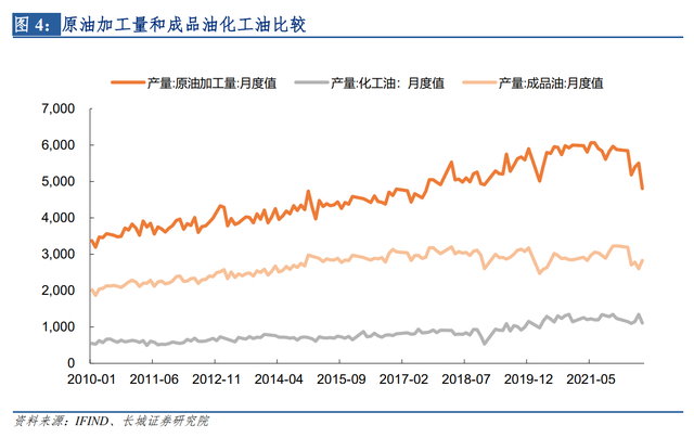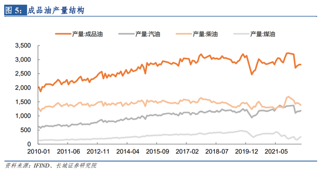 成品油主要包括柴油、汽油和航空煤油,其中柴油占比最大,汽油其次,航空煤油最少。但2021年柴油产量一度下降至汽油产量附近,下降趋势明显。