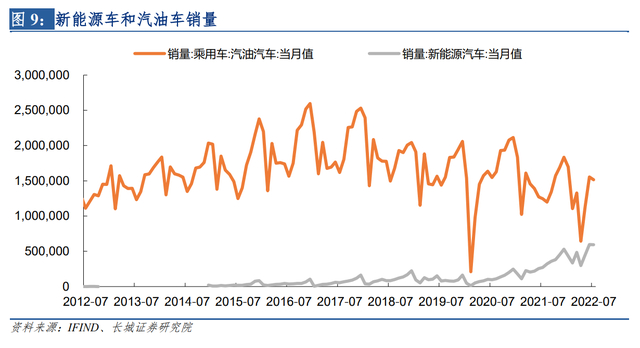 从2015年开始新能源汽车快速发展,对汽油汽车的替代作用也逐渐显现出来。2022年7月,新能源车销量59.3万辆,同比增长118.82%;2022年1-7月,新能源汽车销量为59.3万,汽车销量为242万辆,占比为22%。据公安部7月6日发布的统计数据,截至2022年6月底,全国新能源汽车保有量达1001万辆,占汽车总量的3.23%。