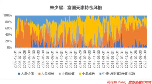 我们可以看到朱少醒在从业初期的收益其实并不是很好,2007年下半年到2008年初甚至跑输了沪深300。在对朱少醒当时的持仓做进一步的分析后发现,2007年下半年正是大盘价值股大行其道的时候,当年上证指数创下了中国股市不可逾越的高峰——2007年10月16日6124点,而朱少醒富国天惠囿于合同规定只能聚焦于成长题材,没有押对筹码,所以在当时业绩并不突出,在2008年初对大盘价值的暴露度才转正,收益也终于向沪深300看齐,不过2008年爆发了全球性的金融危机,2009年中收益有所回吐,好在2009年末有所好转,并拉开了长期跑赢沪深300的序幕。