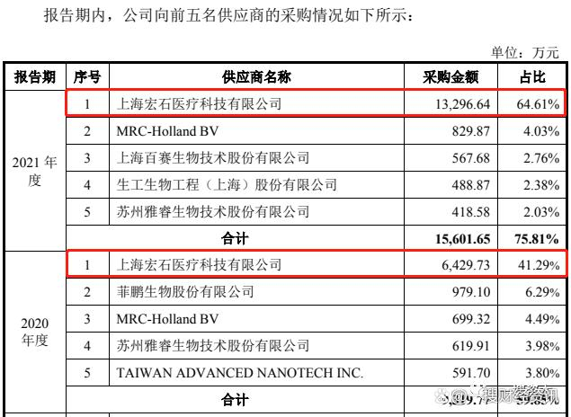 2019年-2021年报告期各期末,上海宏石医疗科技有限公司(以下简称“宏石医疗”)都是致善生物第一大供应商,致善生物向其采购金额分别为1,751.17万元、6,429.73万元、13,296.64万元;占当期采购总额的比例分别为43.19%、41.29%、64.61%,采购占比均在40%以上。致善生物过度依赖第一大供应商,若以后合作关系发生变动,势必会对公司正常经营造成一定影响。