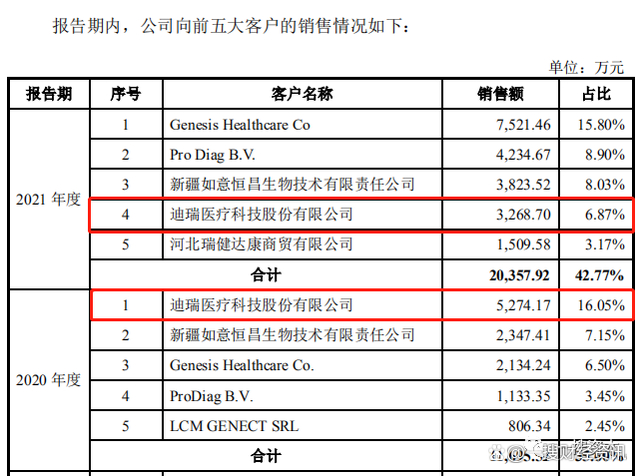迪瑞医疗科技股份有限公司(以下简称“迪瑞医疗”)是致善生物的第二大股东,本次发行前持有致善生物665.27万股份,持股比例为14.78%。2020年-2021年迪瑞医疗也都是致善生物的第一、第四大客户,销售金额分别为5,274.17万元、3,268.70万元;占当期营业收入的比例分别为16.05%、6.87%。