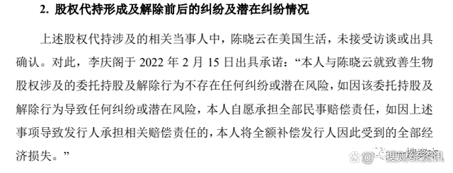 对此,致善生物实际控制人李庆阁于2022年2月15日出具承诺:“本人与陈晓云就致善生物股权涉及的委托持股及解除行为不存在任何纠纷或潜在风险,如因该委托持股及解除行为导致任何纠纷或潜在风险,本人自愿承担全部民事赔偿责任,如因上述事项导致发行人承担相关赔偿责任的,本人将全额补偿发行人因此受到的全部经济损失。”