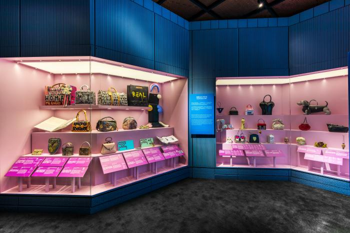 到了1990年代末、2000年代初,出现了红极一时的“It bag”现象。这些被誉为“必不可少的爆款包”以其强大的影响力成为了炫耀性消费的标志,包括LV、Prada等奢侈品大牌或其他街头潮牌在内的多款或经典或爆款的包包,都在这次的展览中可以一站式欣赏到。而更为新近的设计师,则会把手袋变为更加具有趣味和幽默感的装饰品。例如。有的设计师把自己心爱的腊肠犬按照原大小比例做成了手提包;此外还有琳琅满足的天使翅膀背包、小号形手提包、牛奶盒手袋,卷起来的杂志样的手拿包……更多设计师的奇思妙想,都等待着观众去一一发现。