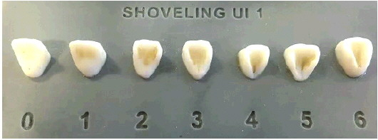 人类上颌中门齿的铲形特征分为四个等级,大部分中国人属于后三种类型,也就是拥有不同程度的铲形门齿特征。
