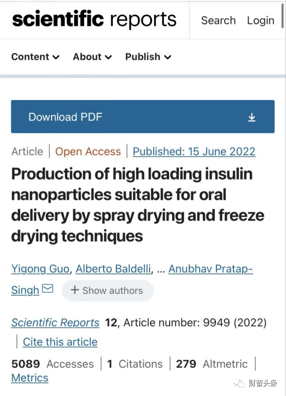 相关研究以“《通过喷雾干燥和冷冻干燥技术生产适合口腔给药的高负荷胰岛素纳米颗粒》(Production of high loading insulin nanoparticles suitable for oral delivery by spray drying and freeze drying techniques)”为题发表于Scientific reports(《科学报告》)学术期刊。