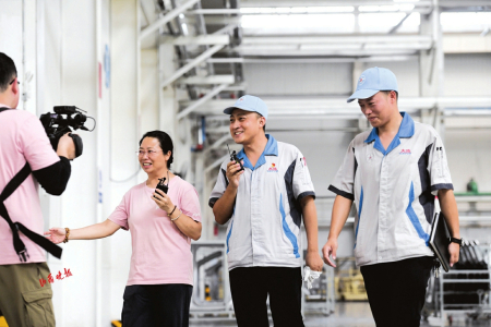 、采访团在大运集团进行直播,乘用车技术中心副总助理王震(右一)与冲焊部负责人李云广(右二)为网友做介绍。