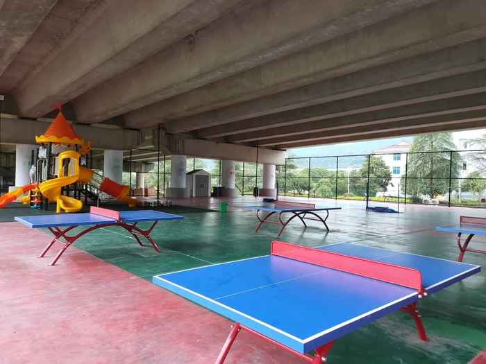 在城南街道上杭社区一品江山小区内,业主利用小区架空层的闲置空间,自筹资金建设乒乓球场地,并向居民免费开放。