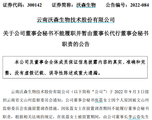 昨日,沃森生物公告称,2022年9月3日接到云南省文山州监察委员会通知,公司董事会秘书张荔因个人原因被文山州监察委员会实施留置调查措施。因张荔在留置调查期间不能履行董事会秘书职责,根据相关法规的规定,在张荔被留置期间,由公司董事长李云春先生代行董事会秘书职责。