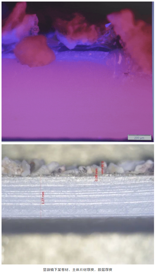 如上图所示,显微镜下的此种卷材,主体片材厚度超过1.2mm,自粘胶层厚度却远不足0.25mm。若胶层厚度不达标且颗粒保护层砂子粒径过大,砂子可能会穿透过薄的自粘胶层损伤主体片材,容易导致该防水卷材实际使用中风险陡增。