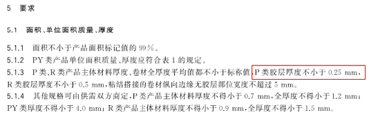 GB/T23457-2017《预铺防水卷材》中明确规定P类胶层厚度≥0.25mm。