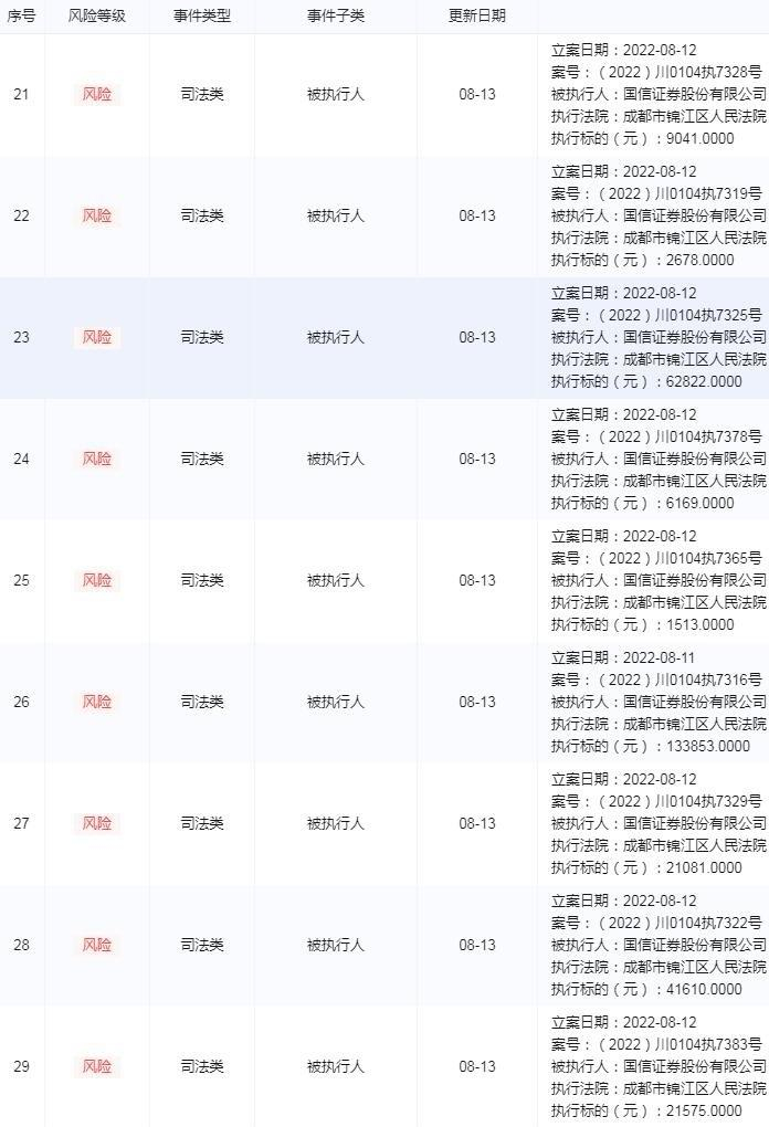 8月证券公司(含券商资管)被列入被执行人的数量大增,有167条,相比7月环比增377.14%。其中以国信证券最多,有142条被执行人信息,执行法院包括成都市锦江区人民法院、彭州市人民法院、成都市温江区人民法院、成都市青白江区人民法院、大邑县人民法院、金堂县人民法院等,其中以成都市锦江区人民法院最多。有律师告诉记者,执行法院和被执行人是同一个,有一种可能是集体诉讼,也有可能是同一性质的诉讼。