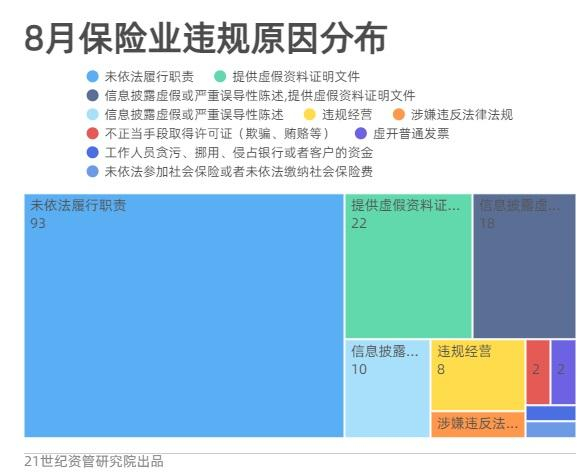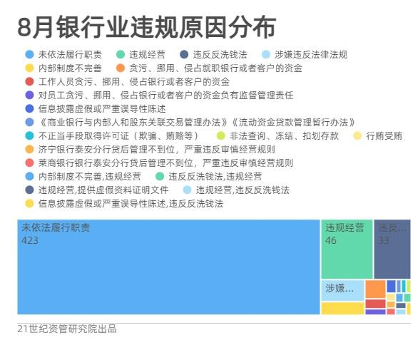 8月银行业和保险业被处罚最多的违规原因为未依法履行职责,银行业违规经营、违反反洗钱法的罚单也不少。提供虚假资料证明文件、信息披露虚假或严重误导性陈述则为保险业处罚频次较高的违规行为。