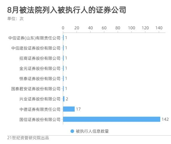 8月金融机构被列为被执行人和失信被执行人的次数环比略增,其中证券公司(含券商资管)被列为被执行人的数量大增,有167条,相比7月环比增377.14%。其中以国信证券最多,有142条被执行人信息。