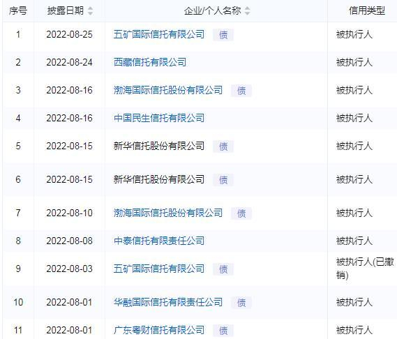 信托公司8月有11条被执行人信息,相比上月减少。其中新华信托、五矿国际信托、渤海国际信托均有2条被执行人信息。