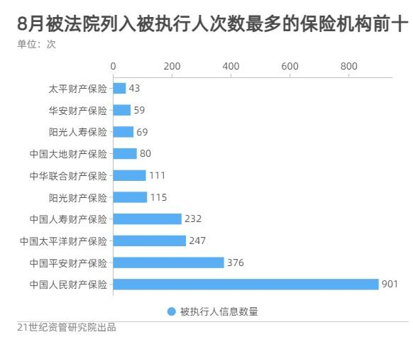 8月银行业机构仅中国邮政储蓄银行股份有限公司长沙市火星大道营业所被法院列入失信被执行人名单;保险公司中,中国人寿财产保险股份有限公司8月两次被列入失信被执行人名单,涉及分支机构泗洪县支公司、高安支公司。