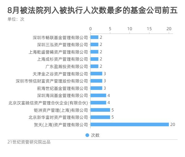 基金公司8月份被法院列入被执行人的信息有70条,相比上月环比减少12.5%。其中被列入被执行人次数最多的是贺天(上海)资产管理有限公司。