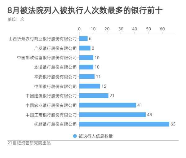 从不同机构金融机构来看,8月银行业有413条被执行人信息,相比上月环比略减少6.35%。其中抚顺银行被法院列为被执行人次数最多。其次是工商银行和农业银行。