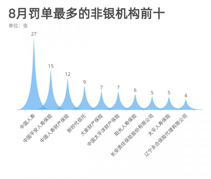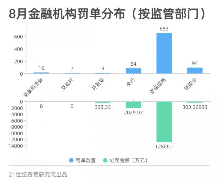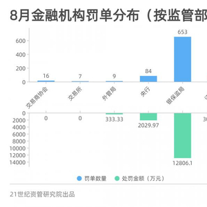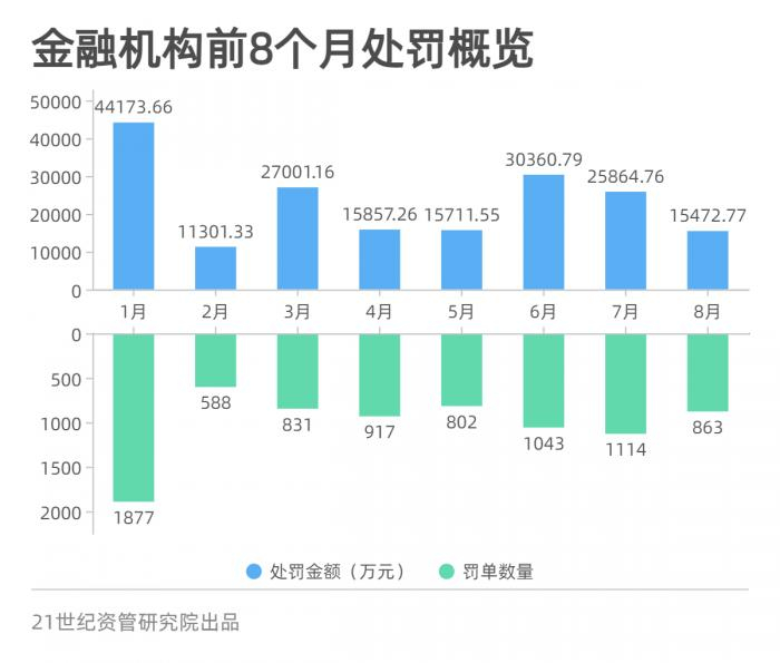 今年8月份金融机构共收到863张罚单,被处罚金额合计1.55亿,相比7月环比减少40.18%。其中银保监会及派出机构开出的罚单依然最多,共开653张罚单,合计处罚金额1.28亿。