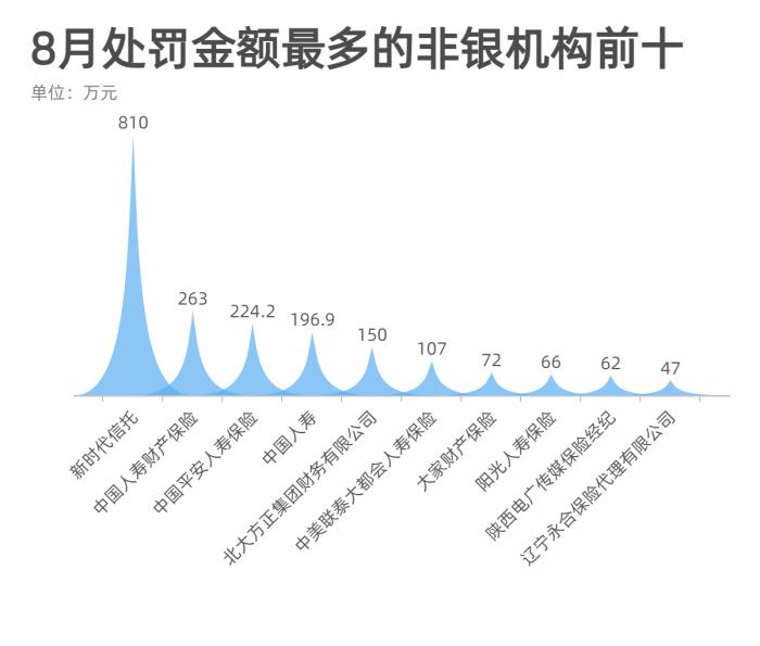 从不同机构类型来看,8月银行业罚单数量和处罚金额依然最多,其中8月合计被罚金额过千万的银行有中国银行、中信银行。8月合计被罚金额最多的非银机构为新时代信托。