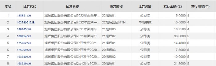 另外,旭辉控股集团及上海旭辉企业管理有限公司两个平台合计存续境内公司债、券商资管计划等9笔,合计人民币141亿元。其中一年内到期回售的一笔,即公司债“20旭辉01”,债券余额人民币21.2亿元,明年5月面临投资者回售选择权,目前价格百元债券面值为72元。