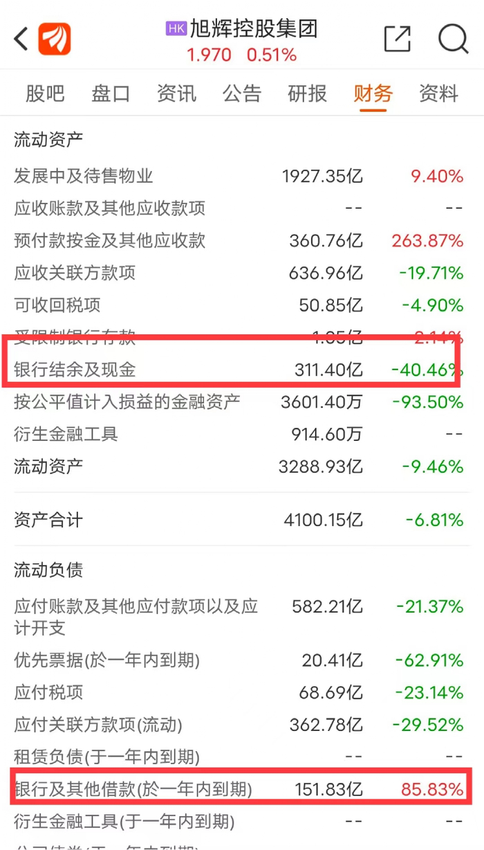 一是“银行结余及现金”下滑40%,录得311亿元,而一年内到期的“银行及其他借款”却大幅上升了85%,录得151.8亿元。虽然银行结余可以覆盖银行借款等短债,但旭辉另有900多亿的应付账款及应付关联方款项,其中有多少一年内要付将很大程度上决定资金压力。