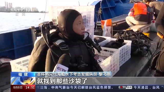 圣杯屿元代海船水下考古发掘队员 黎飞艳:我们后来在定位沉块旁边找到那些沙袋了,转了一下以后找到的,找到以后我们就把沙袋往那边移,移了大概有十几袋二十袋吧。
