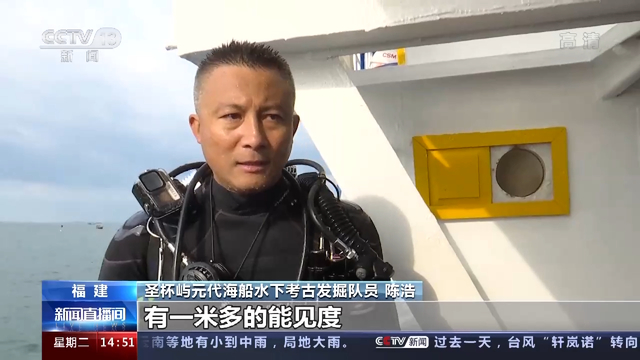 圣杯屿元代海船水下考古发掘队员 陈浩:有一米多的能见度,跟去年相比的变化,遗址变化还是蛮大的,都被泥沙覆盖了。