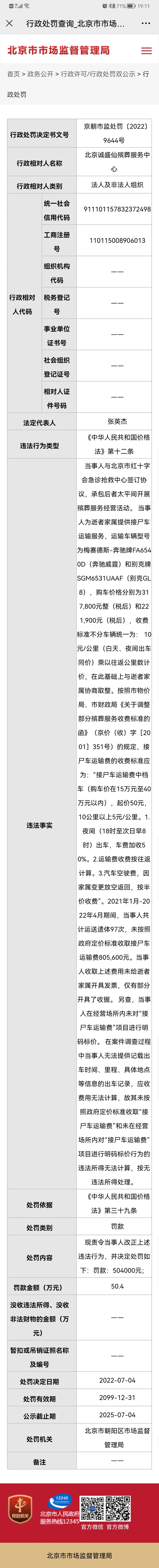 在2021年1月至2022年4月期间,承包北京市红十字会急诊抢救中心太平间的北京诚盛仙殡葬服务中心,共计运送遗体97次,在没有对“接尸车运输费”项目进行明码标价的情况下,未按照政府定价标准收取接尸车运输费80.56万元,且未给逝者家属开具发票,仅有部分开具了收据。7月4日,朝阳区市场监管局对其罚款50.4万元。