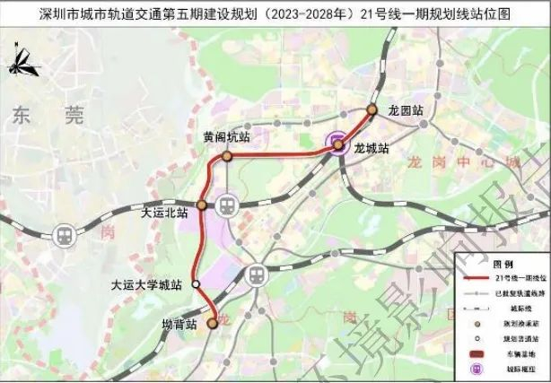 地铁21号线一期起于坳背站,终至龙园站,线路全长约12.5公里,全线设站6座,全线采用地下敷设。21号线一期为服务龙岗区内部的快速线路,支持龙岗中心区、大运深港国际科教城等重点片区发展,服务龙岗中先进制造业园区。通过衔接14号线、深惠城际加强龙岗对中心城区快速通勤。